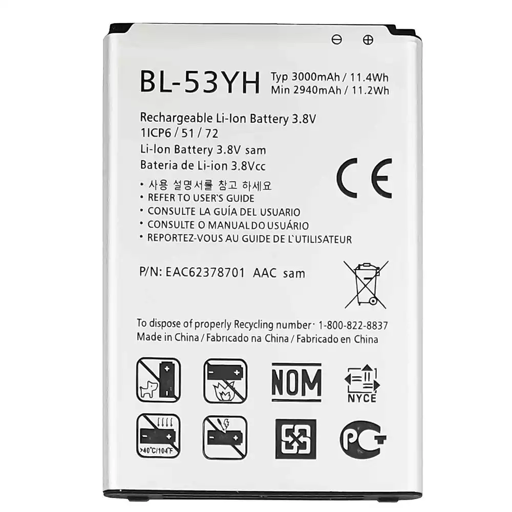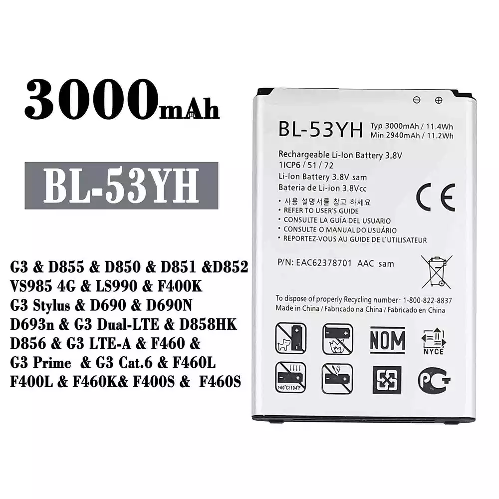 Akku BL-53YH alkalmas LG G3 / D855 / D850 / D851 / D852 / VS985 4G / LS990 / F400K / G3 Stylus / D690 / D690N / D693n / G3 Dual-LTE / D858HK / D856 / G3 LTE-A / F460 / G3 Prime / G3 Cat.6 / F460L / F400L / F460K / F400S / F460S